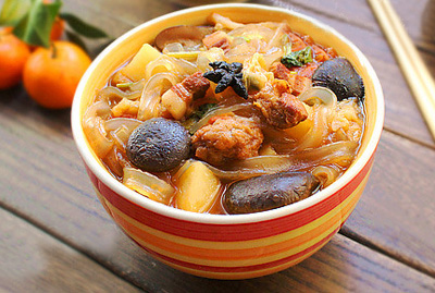 ![]() 主料:五花肉300克 辅料:红薯粉200克,白菜8片,叶子肉丸10个,香菇20朵,土豆2个,西红柿2个,香菜3棵 调料:花生油适量,食盐15克,醋5克,冰糖5粒,八角1个,老抽10克,香油2克,水适量 传统大锅菜的做法 1.五花肉1.5厘米左右的丁,冷水入锅焯水后用温水冲洗掉表面的浮末,控干水分后加盐1大勺和老抽腌制15分钟 2.香菇提前泡发后多冲洗两遍,然后挤干水分用刀一切为二 3.大白菜用盐水泡15分钟,控水后用手撕成小片备用(白菜帮撕的时候要分层撕,撕的块小一点) 4.土豆削皮后切滚刀块,用水洗掉表面的淀粉 5.红薯粉条剪成合适的长度,用温水泡软 6.西红柿洗净后切块,香菜洗净后切小段,加入适量的醋和少量香油拌匀 7.炒锅内放适量的花生油,加入大料和冰糖炒一下糖色 8.待炒锅内出现深棕色的泡沫时放腌好的五花肉,中火翻炒至肉丁上色 9.下土豆和香菇翻炒2分钟 10.放撕好的大白菜,调入适量的盐,大火翻炒至白菜变软 11.加入切好的西红柿,翻炒均匀 12.加入适量的白开水和泡好的红薯粉条,盖上锅盖大火烧开后转小火炖煮至粉条变软无硬心 13.粉条炖的差不多时下肉丸子,继续小火炖煮至肉丸子热透(这时可以尝一下汤的咸淡再酌情加盐) 14.出锅前调入拌好的香菜即可食用 烹饪技巧 1、这道菜的调味主要在腌制五花肉和炒白菜这两个步骤,腌制五花肉一定要到位要不然后期炖的时候五花肉的咸味容易被白菜和香菇吸走,炒白菜时放盐一是为了让白菜快速变软,二是为蒸锅菜二次调味,一般有经验的经过这两次放盐就可以将整整锅菜的咸淡控制的很好了,如果你觉得把握不好的话炒白菜的时候少放盐,等粉条炖的差不多时尝一下汤的咸淡再酌情放盐; 2、大锅菜里的材料可以按照自己喜好调整,诸如海带、炸豆腐、排骨等都可以放,但五花肉、粉条必不可少。 |