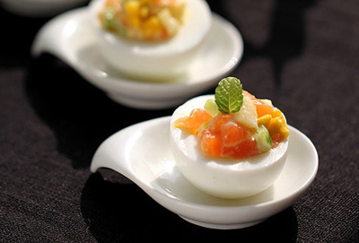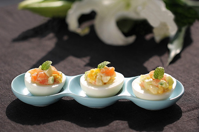 烹饪技巧 1、用煮蛋器煮鸡蛋时要用针在鸡蛋的大端上扎个小洞,在放入煮蛋器中煮熟;煮熟的鸡蛋立即放入冷水中,利用热胀冷缩的原理,这样鸡蛋壳很容易的剥开了; 2、先将三文鱼、黄瓜、苹果切成小粒,注意苹果容易变色,所以要泡在淡盐水中;煮好的鸡蛋在对半切开,将蛋黄取出,再将蛋黄也切成小粒; 3、最后将准备好的鱼、蔬菜、水果的小粒一起放入小碗中, 加入沙拉酱搅拌均匀,再用小勺回填放入鸡蛋中。 |