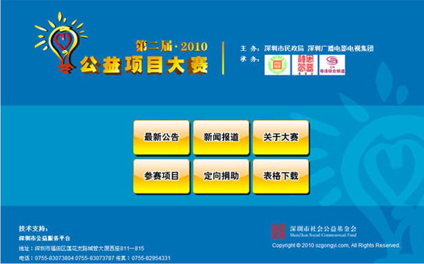 大赛背景及目的和意义 以建设“和谐深圳”为目标,面向全社会征集、评选公益创意项目和公益慈善实施项目,借此带动爱心企业和个人的积极参与,进一步推动公益慈善事业的可持续发展。大赛全方位渗透“深圳公益在行动” 的风貌和主旨,促进公益慈善专业机构成长,打造品牌公益项目,提供企业履行社会责任的强大平台,提高全民公益慈善意识,使社会上最需要的人得到更多的关爱和帮助。 本届大赛沿用公益慈善创投方式,即为公益慈善组织提供创业及发展资助,包括综合性能力建设及员工志愿者在内的多维协助,提升民间公益慈善组织的技能和经验。公益项目以比赛的方式向社会呈现,吸纳社会资源与优秀项目对接,持续放大公益慈善项目的社会影响力和效益,引导更多的主体参与社会公益行列。“公益项目大赛”通过网络、电视等传播媒介,采用多种形态及各种宣传载体使比赛更富成熟性、创新性和引领性,让社会公益慈善项目脱颖而出,通过调动社会资源,高效推进项目的口碑和社会接纳度,打造深圳公益慈善品牌。 二、大赛组织机构 周末设计专业提供高品质的网站建设、高端精美网站设计、一流的FLASH动画互动设计制作、网站推广、网站维护等综合服务。现经过周末设计精心策划为公益基金大赛提供网络设计及维护,网站建设项目已经完成并成功上线,欢迎浏览。