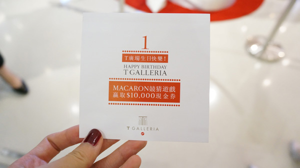 8月刚好是T GALLERIA一周年庆,活动超级给力!在店任意正价消费,都有机会均获得参加抽奖活动,每小时会都会抽出最高1500港币的现金券;而且猜生日蛋糕上马卡龙的数量还有可能得到1W港币的现金券!是不是觉得错过了时间很可惜^^