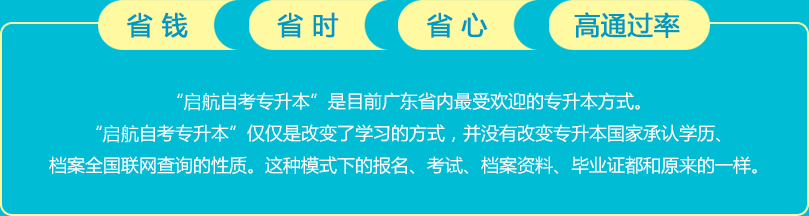 启航教育秉承着"用心做教育"的办学理念,潜心研发,经过十余年办学经验的整合与优化,凭借优秀的资质与实力,整合目前多种技术手段( 包 括网络、微信、智能系统、APP 等 ),打造出了首创广东省独一无二的、简单便捷的助学方式——利用"互联网 +"通过资源整合,在不改变专升本学 历与考试的前提下,打造出了专业更多、学习更灵活、师资更优质、通过率更高的全新专升本模式,受到省内外众多学员的认可和追捧,并被行业逐渐 认可和模仿,约定俗成称为"启航自考专升本"学习模式。